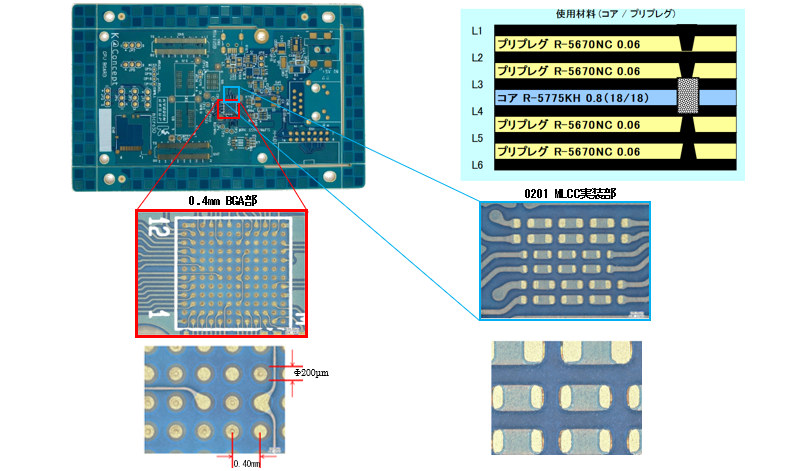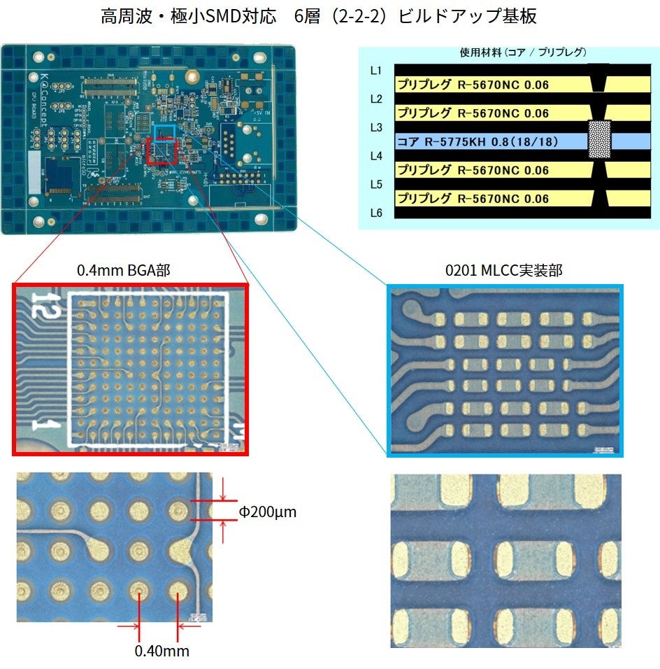 高速デバイスや、狭ピッチ・多ピン化が進んだ高密度・高集積半導体を搭載する小型機器には、高周波材を採用した多段ビルドアップ基板が有効です。