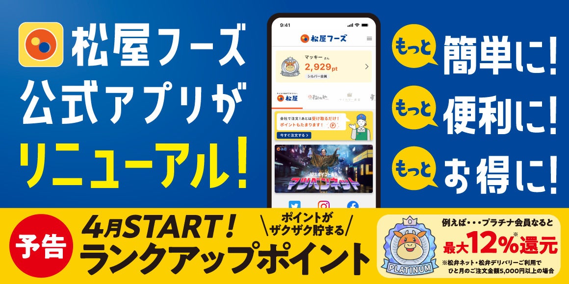 松屋フーズ各店のテイクアウトが便利でお得な松弁ネットが、よりお得で、使いやすくなります。