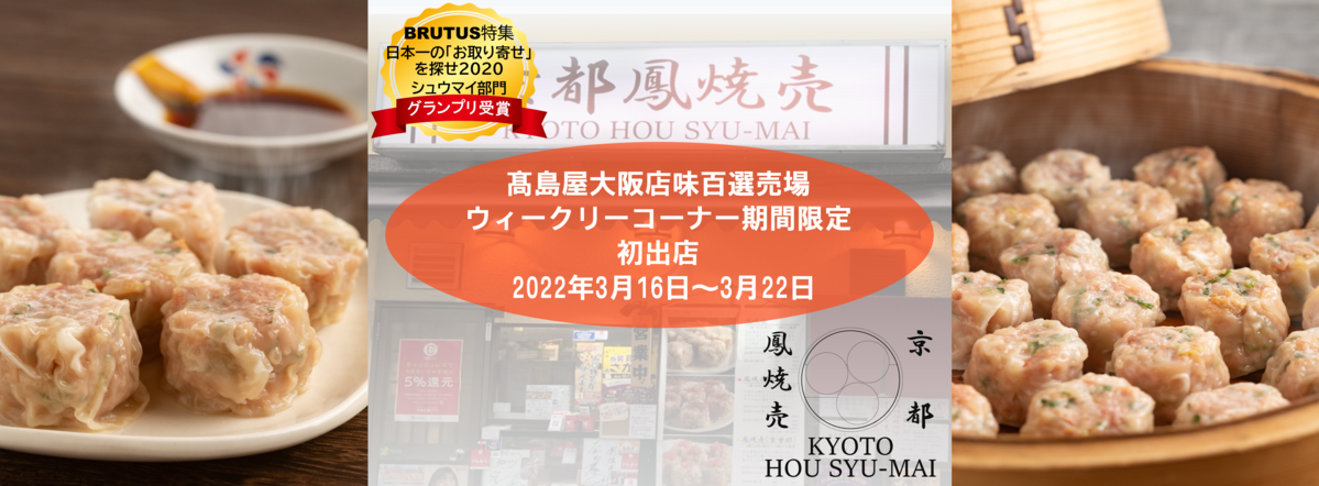 株式会社京都鳳焼売(本社:東京都品川区平塚、代表取締役:大谷豊孝)は、焼売の名店が数多く存在するエリア、また当店オンラインショップでも購入数の多いエリア、大阪において株式会社髙島屋の協力のもと、2022年3月16日より3月22日までの7日間、髙島屋大阪店地階味百選売場ウィークリーコーナーに初出店することとなりました。