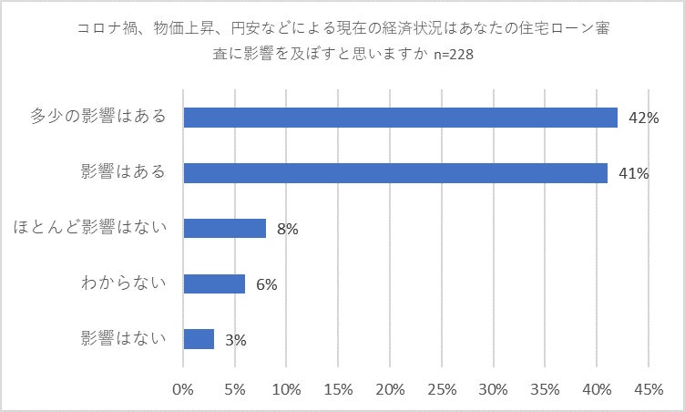 コロナ禍、物価上昇、円安の進行などにより日本経済が厳しい状況に置かれている中、住宅ローン利用予定者に「現在の経済状況が住宅ローンの審査に影響を及ぼすと思いますか」と質問したところ、「多少の影響はある」との回答が42パーセントでトップとなり、僅差で「影響はある」(41パーセント)が続きました。「ほとんど影響はない」は8パーセント、「影響はない」との回答は3パーセントでした。「多少の影響はある」と「影響はある」の合計は83パーセントとなり、「ほとんど影響はない」と「影響はない」の合計11パーセントを大幅に上回る結果となりました。
