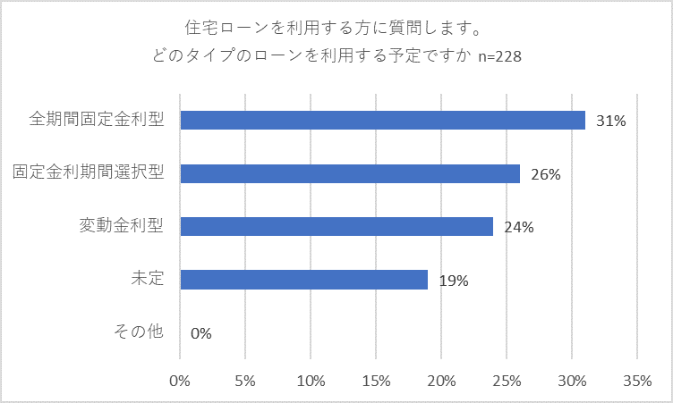 次に、住宅ローンを「利用する」と回答した228人に利用予定の住宅ローンのタイプを質問したところ「全期間固定金利型」が31パーセントで最多となりました。以下、「固定金利期間選択型」が26パーセント、「変動金利型」が24パーセントで続きました。また、19パーセントが「未定」と回答しました。