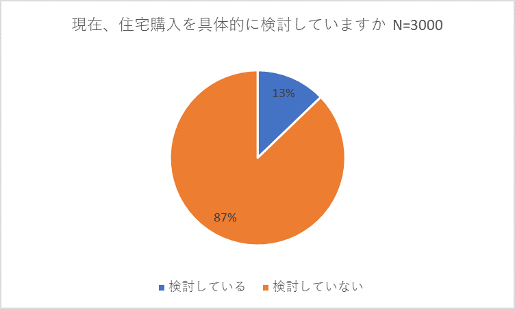 暮らしのすぱいすでは30代~50代の男女3,000人に現在、住宅購入を具体的に検討しているかを質問したところ、13パーセントが「検討している」、87パーセントが「検討していない」と回答しました。