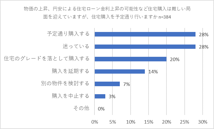 <調査> 物価高・円安が進行する状況における住宅購予定者の意識調査 住宅購入予定者のうち「予定通り購入」と「迷っている」がともに28パーセントで最多、また4割以上が予定を軌道修正