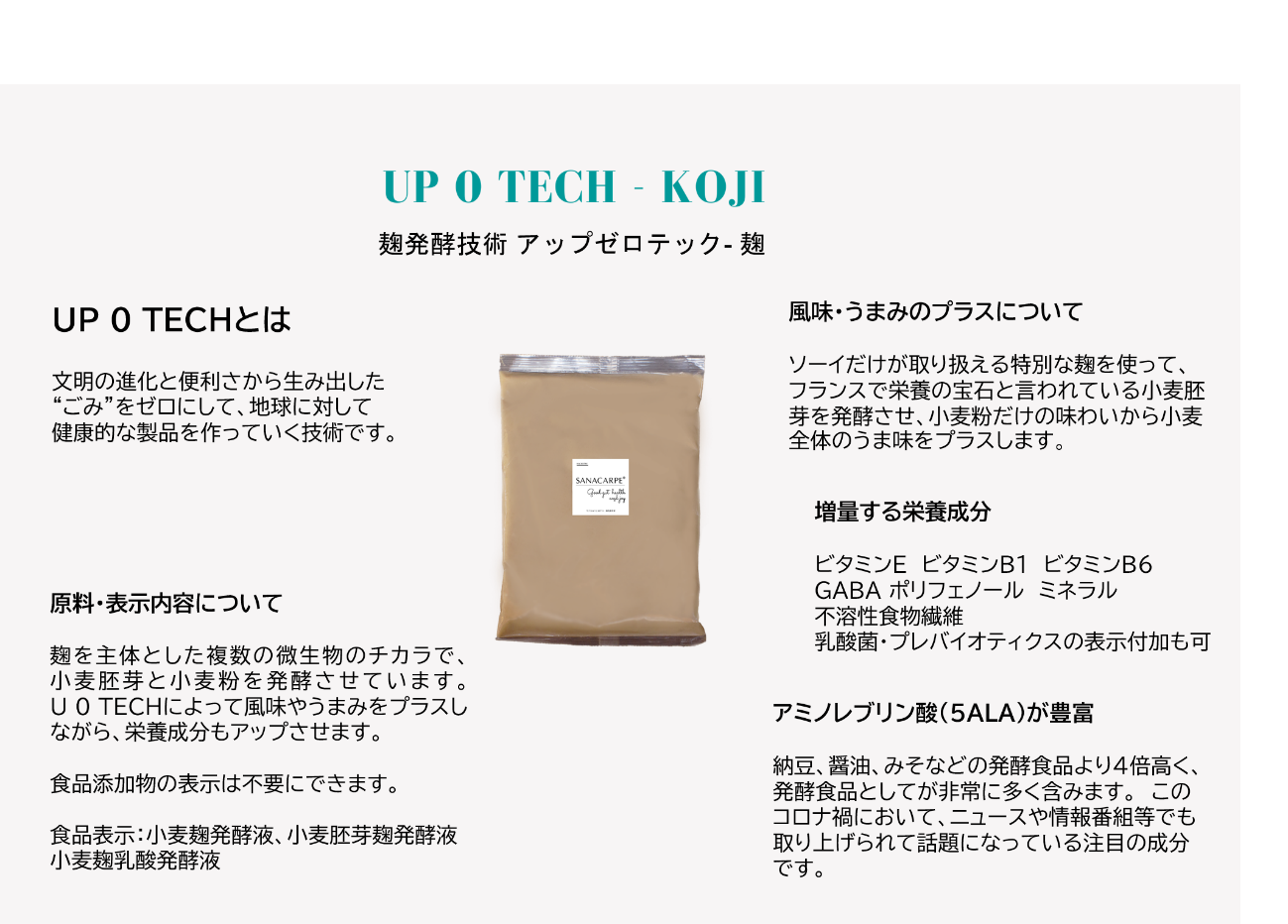 「SANACARPE® 」は麹発酵していますが、発酵前に比べて不溶性食物繊維の増加やGABAの検出、アミノレブリン酸(5ALA)などの有用性成分が生成されていることが判明しています。