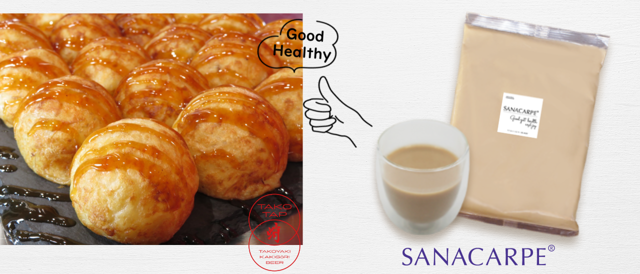 小麦製品の生地物性を良くする目的で開発した材料です。昨今はWithコロナ時代を迎えると予想されていますが、その時代を生き抜くにはやはり免疫力を高めることが必要であり、特に腸活への意識が日に日に高まって来ています。当社のモットーとして「皆様に健康をお配りする」と「自然の本来あるべき姿を追求」から、化学製品に頼らず、天然材料使用にこだわり、280年程の伝統のある発酵DNAによる発酵技術を用いることで化学製品だけでは得られない健康効果を持ち合わせた素材作りをしています。そして、創業当初から続く製パン用の生地改良材作りの中で、出来るだけアレルゲンを排除して開発した素材が麹発酵食品素材「SANACARPE® 」です。当初の使用目的であった製パンに留まらず、麺やその他の小麦製品にも使用範囲を広げています。Withコロナに対応できる腸活意識した体作りの応援をしていくために、例えば、発酵ドリンクとしてのご提案、従来通りの食品素材としてパン以外の麺への添加に留まらず、新たなる展開として今回たこ焼きという分野で蛸TAP様とコラボレーションしました。