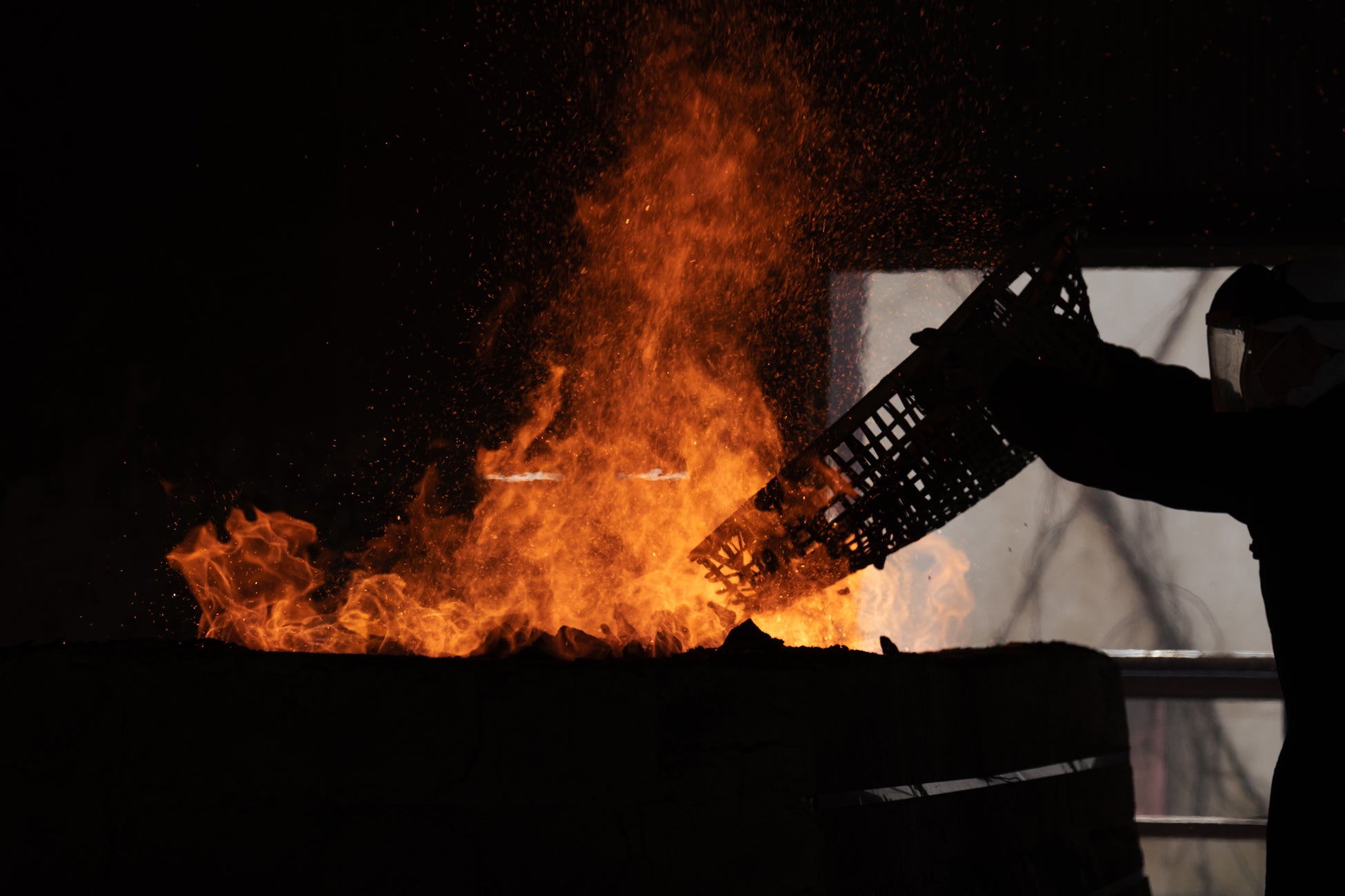 ・玉川堂(新潟):鍔薬罐を写した巨大作品への彫金実演