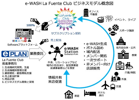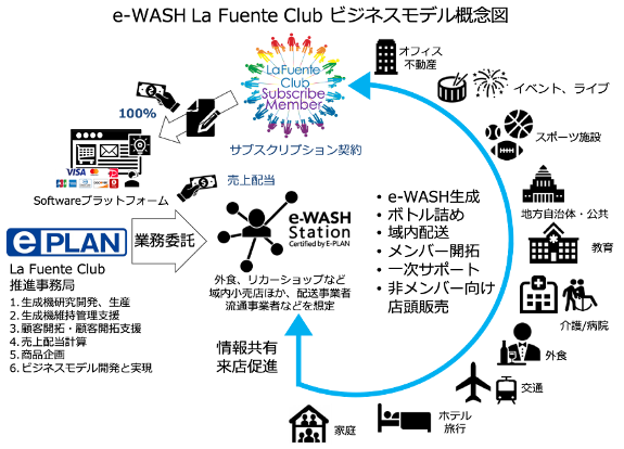 Eプランが販売するスーパーアルカリイオン水の「e-WASH」は、強力な洗浄力を実現しながら安全かつ環境にも優しい塩素を含まないものとして、工業用だけでなく地方自治体や公共機関、さらに家庭においても用途が拡大しています。弊社は従来、製造業向けに開発したスーパーアルカリイオン水の生成装置販売を中心に事業を展開して参りましたが、今回のサブスク販売網「La Fuente Club」を機に、ボトル製品である「e-WASH」の販売にも注力することにしたものです。当面、東京23区、神奈川・千葉、大阪、愛知、福岡などのエリアを対象にスタート、初年度100社のパートナー獲得を目指します。
