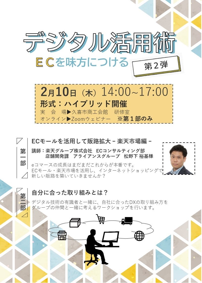 こうしたデジタル化の流れを味方につけるため、下記のとおりセミナーを2回開催します。各回とも、第1部はECを始めたいとお考えの事業者の方を対象にした講演形式、第2部は参加者の経営課題の解決に役立つデジタルツールを検討するワークショップ形式です。