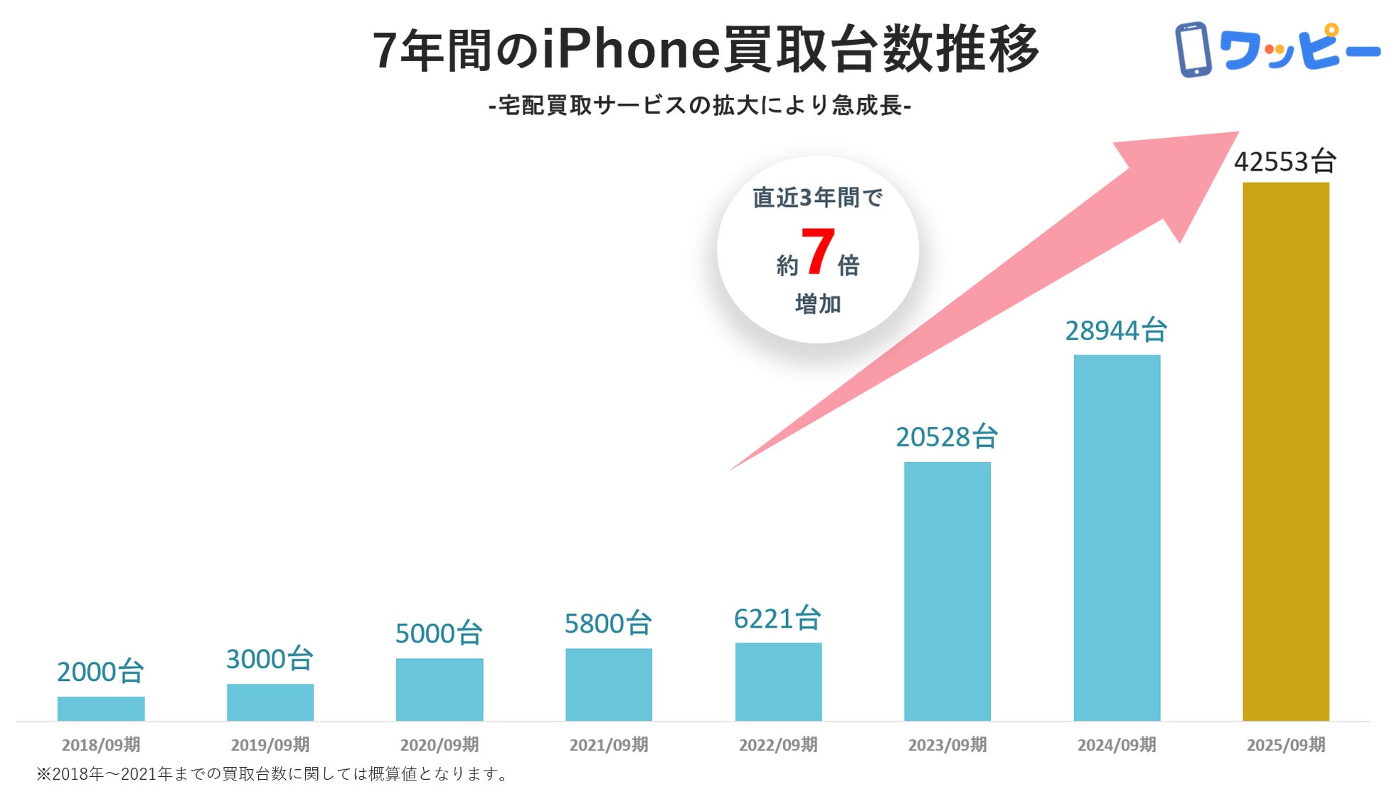 「ワッピー」は、サービス開始から順調にiPhone買取台数を増やし、2024年は年間4万台を突破しました。今後もiPhoneシリーズのオンライン宅配買取サービスの需要は伸び続けることが想定されます。