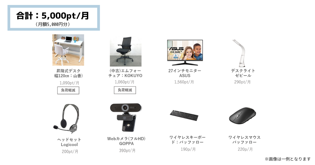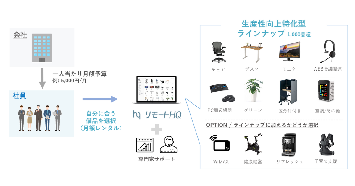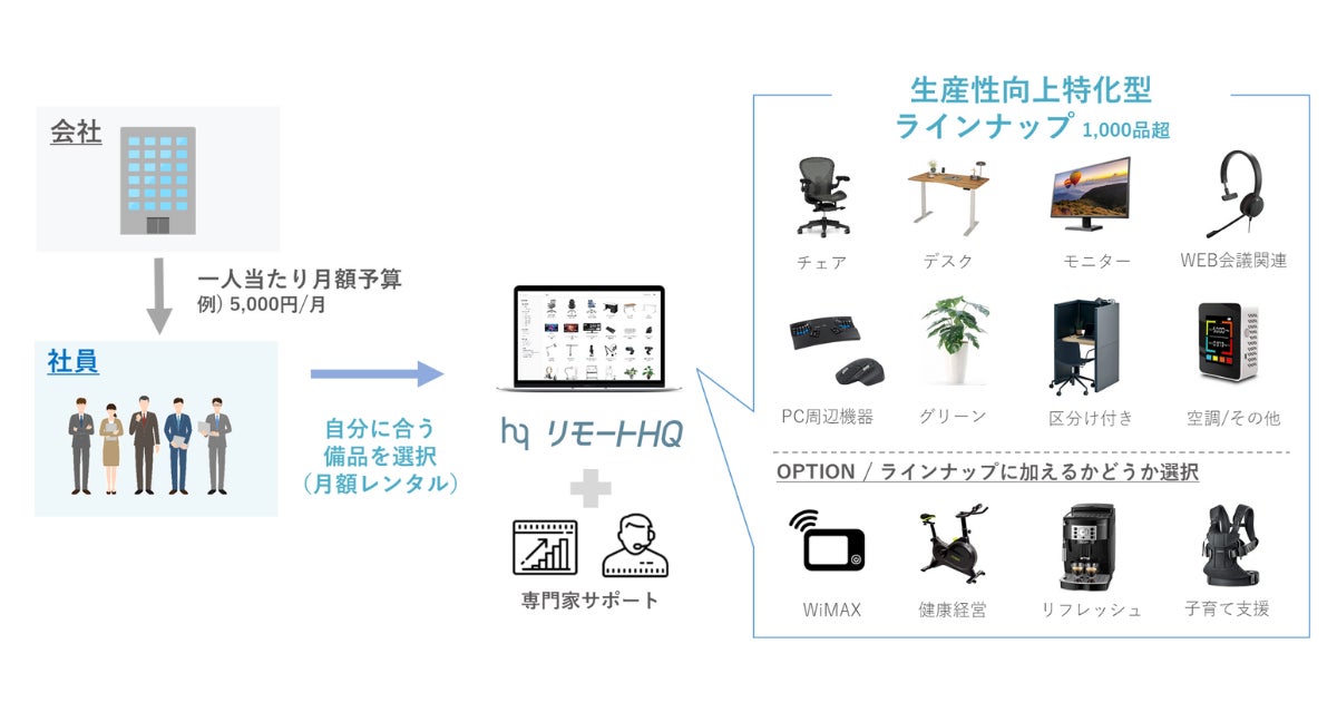 パソコンデスクやチェア、モニター、ウェブカメラといったリモートワークに必須の備品類から、在宅勤務における心身の健康をサポートするフィットネス機器やリフレッシュ家電に至るまで、計1,000点超のアイテムから、各企業が設定したポイント数(=社員一人あたり月額予算)に応じて各社員が最適なものを自律的に選択できます。状況にあわせて返却・追加・交換を行うことで(レンタル形式)、常に最適なリモートワーク環境を構築することができます。