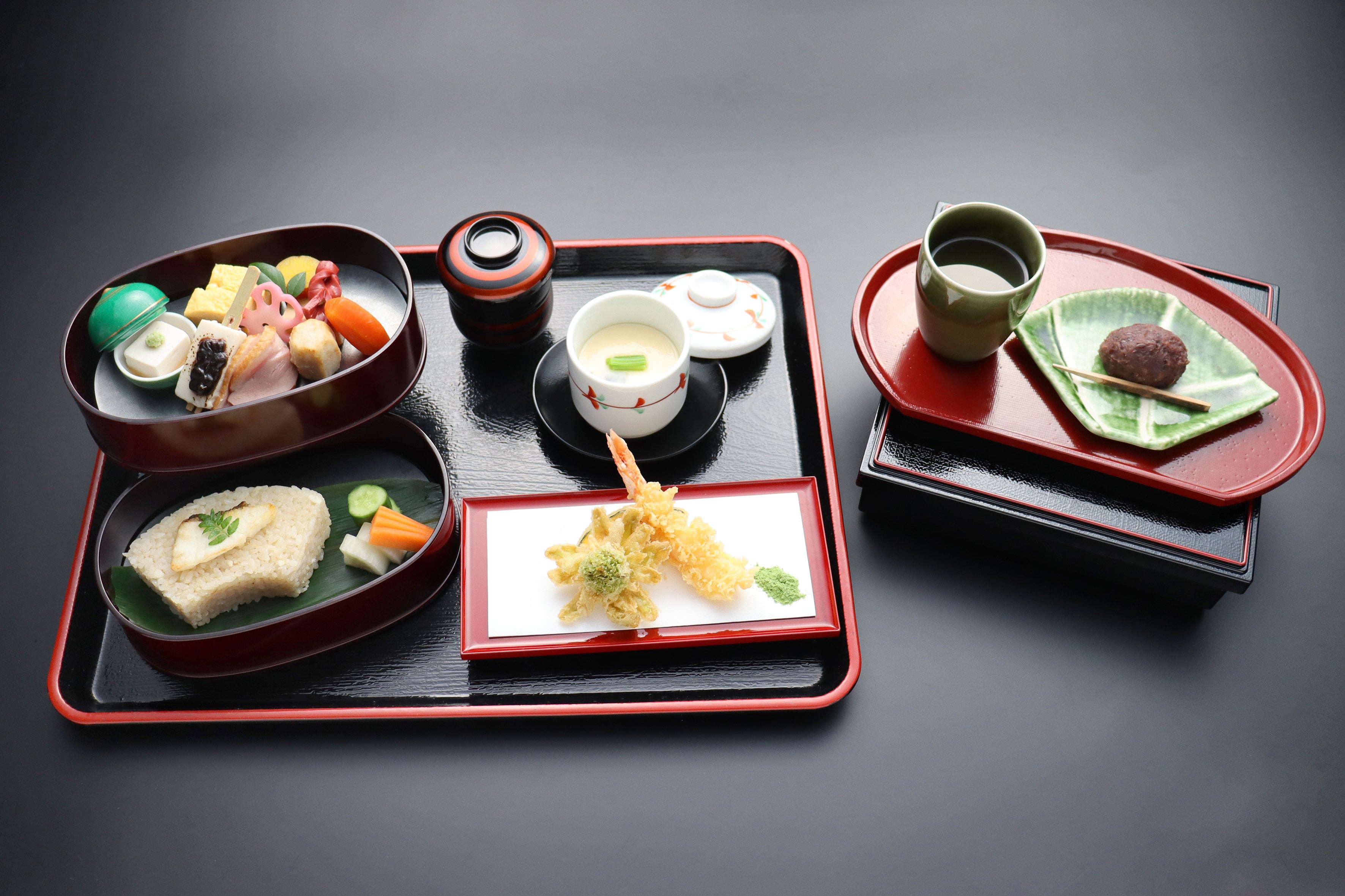 1.梅こぶ茶で炊いた「鯛めし」と「おはぎ」を含む、特別メニュー「鯛めし御膳」をご提供