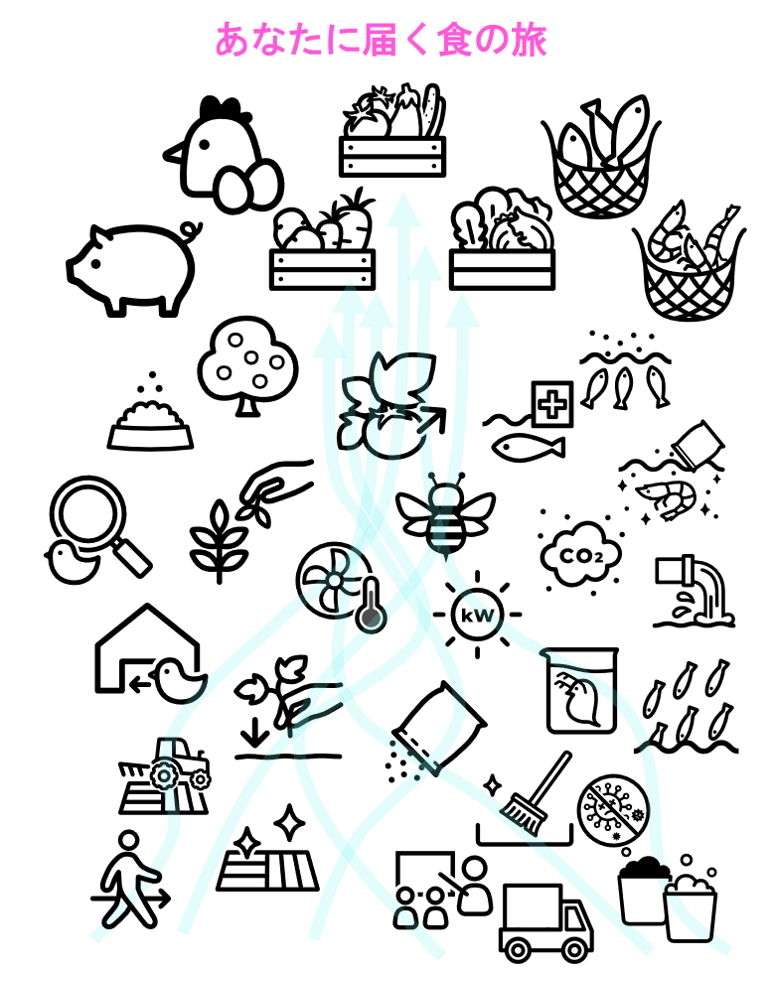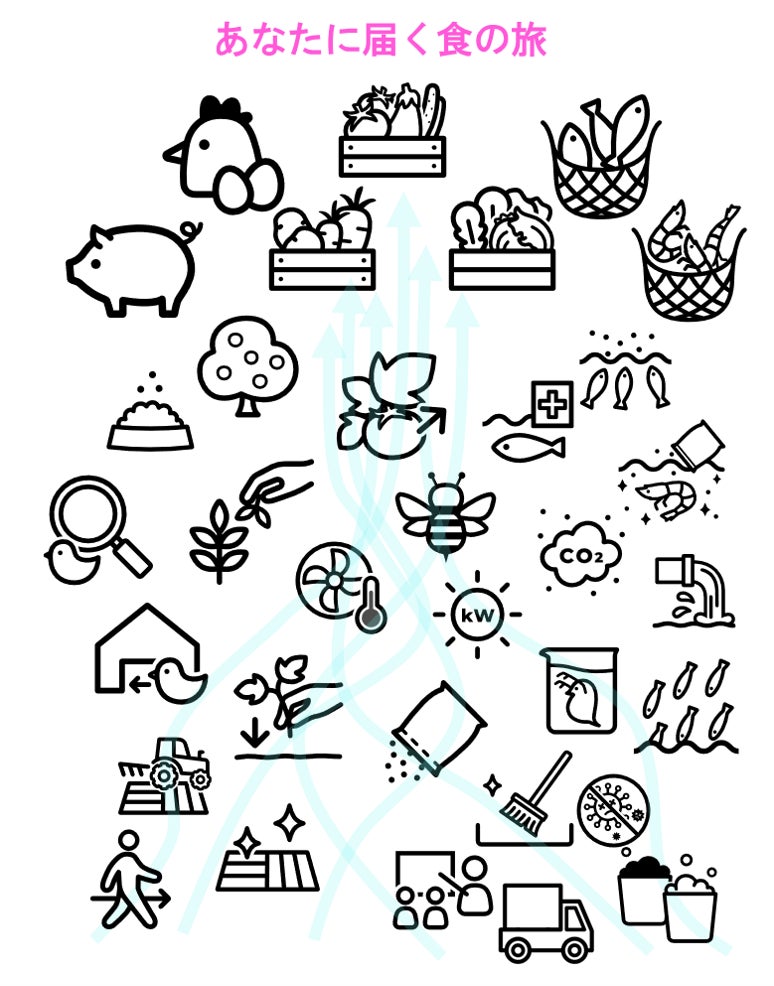 生き物の成長に関わるのは、生産者だけでなく、種苗、肥料や飼料、薬品、物流などを提供する人々もいらっしゃいます。これらの人々が継続的に連携し関係を作ることで、安定的な生産と食の供給を持続することが出来るようになります。この関係性が相互にとって適切でフェアである(=品質とコストのバランスがとれている)状態となっていることは持続性を生み、関係する人たちをハッピーにします。