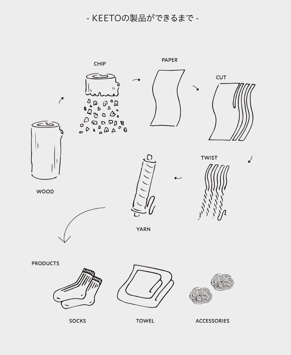 「KEETO」がたくさんの人を巻き込んでクリエイトされ、私たちの暮らしの中で当たり前に使われる第5の天然繊維として世の中に広がるよう活動して参ります。第一弾としてKEETOの特性を実感していただくために『すぎのソックス』を作りました。