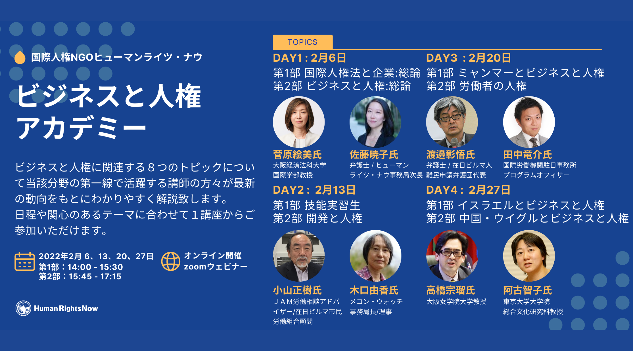 東京を本拠とする国際人権NGOヒューマンライツ・ナウは、2月の日曜日に4週連続講座「ビジネスと人権アカデミー」を開催します。ビジネス領域における人権への取り組みがますます求められる今、それぞれの課題にどのように取り組むべきなのか。ビジネスと人権に関する各テーマを実践されている方々をお招きし、ビジネスと人権の基本から最新の動向まで、解説いたします。