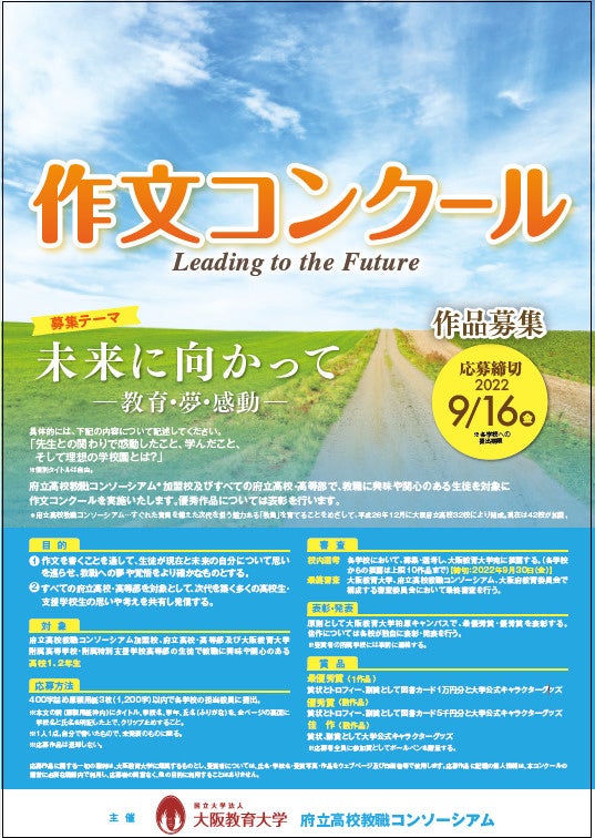 大阪教育大学と府立高校教職コンソーシアムは、教職に興味や関心のある府立高校等の1、2年生を対象に、「未来に向かって―教育・夢・感動―」をテーマとした作文を募集します。