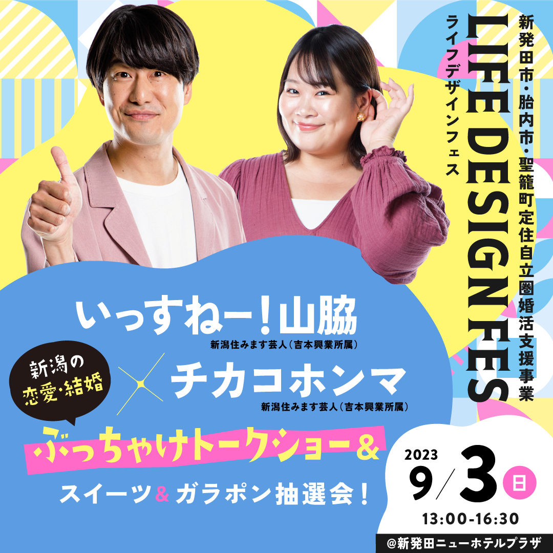 \幸せの7号線事業/ 新発田市・胎内市・聖籠町定住自立圏婚活支援事業 いっすねー!山脇×チカコホンマ 新潟の恋愛・結婚ぶっちゃけトークショー&スイーツ&ガラポン抽選会!ライフデザインフェスを開催