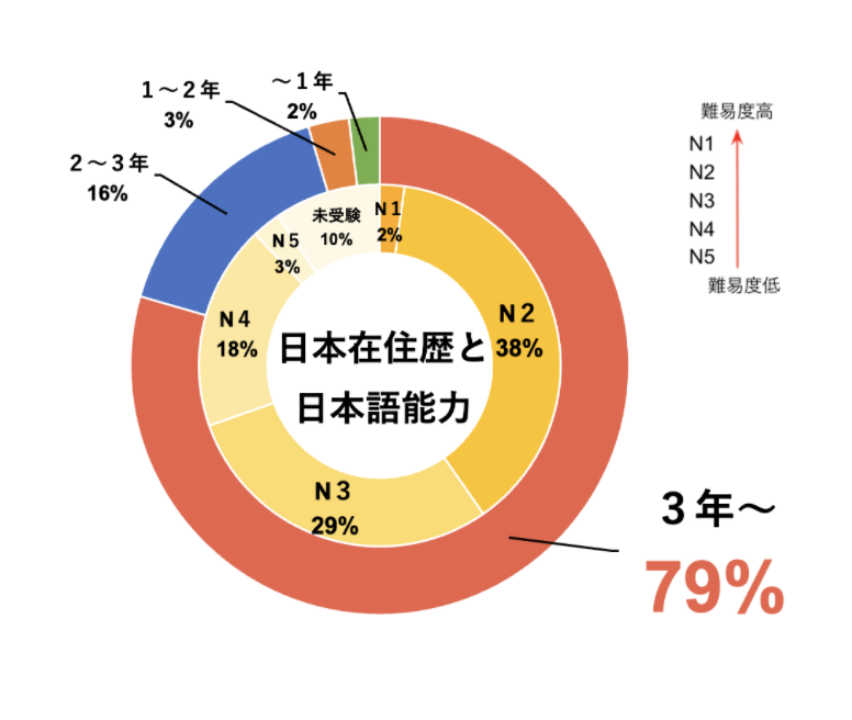 長期にわたる日本での留学・就労経験から、日本の文化やマナーに理解のある外国人を中心にご紹介させて頂けます。日本語レベルとしてはN3以上の外国人が全体の約7割を占めており、日本人と流暢なコミュニケーションが可能です。
