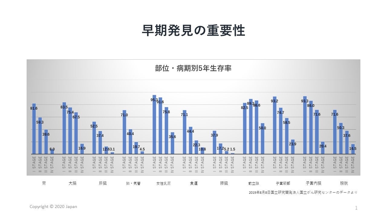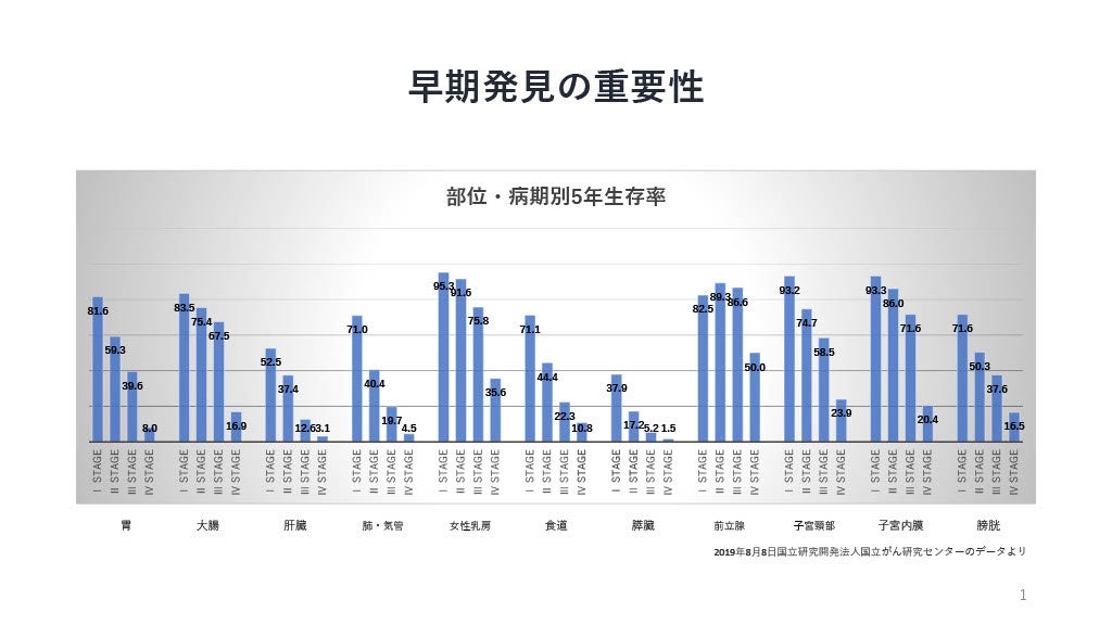 常々言われていることですが、がんは早期発見が重要で治療の効果を左右します。早期発見できたときとできなかったときの5年生存率は5倍以上変わってくるものもあります。