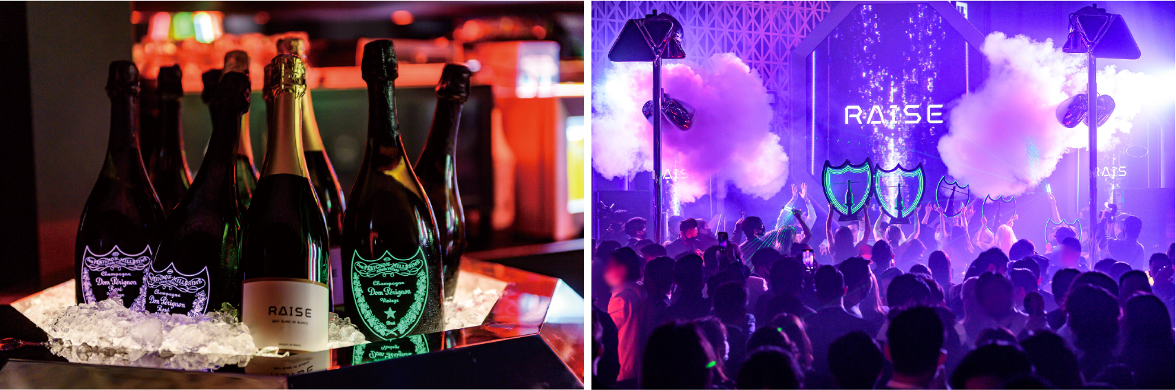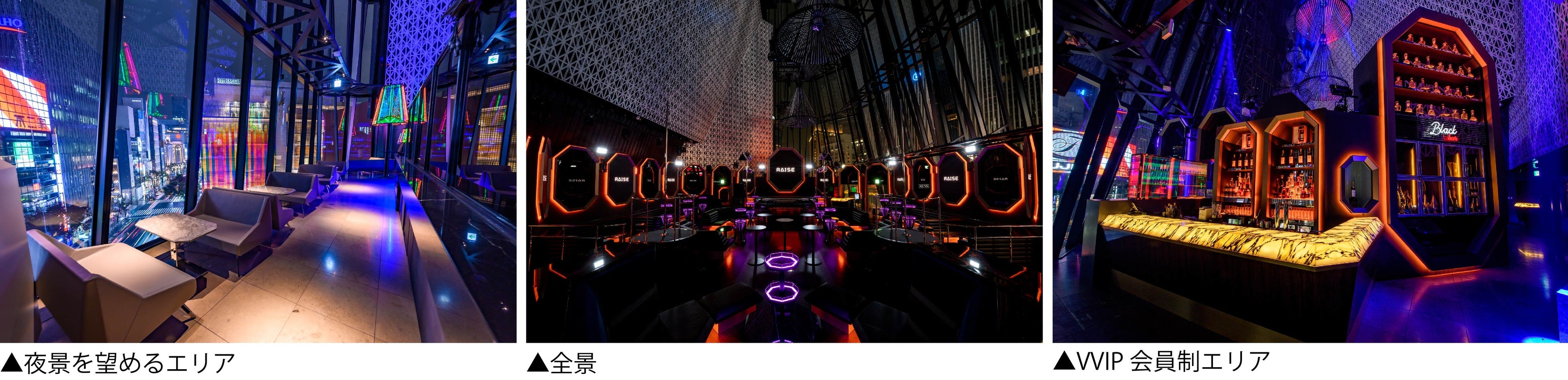 RAISEは、「最上級のナイトライフを創造する」をコンセプトに、東京・銀座5丁目数寄屋橋交差点のランドマーク、大型商業施設「東急プラザ銀座」6階にオープンした、大型 VIPラウンジ&クラブです。 世界のナイトクラブで も類を見ない天井高約27mという圧倒的なスケール感と、銀座の夜景を望めるガラス張りの煌びやかな空間に、近未来の都会的な夜をインストール。RAISE クリエイティブチームによる、ブラックとゴールドを基調としたシック な内装には、独創的でシンボリックなLEDビジョン、重厚感のあるソファーシート、近未来的なマテリアル、野外フェスレベルの最大出力の特殊効果・演出装置を採用しました。開放的なダンスフロア、コンセプトの異なる3つのバー、快適で遊び心のある22テーブルのVIP / VVIPシート。上質な音楽とシャンパンをはじめとした豊富なドリンクを楽しみながら、ドレスアップして大人が楽しめる都会的なラグジュアリー・ナイトライフを提案します。