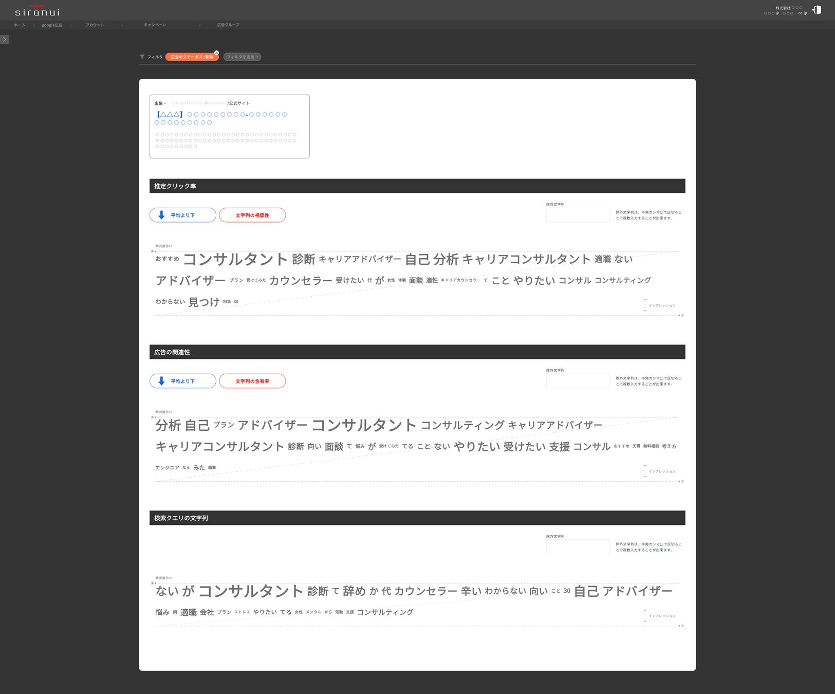 また検索クエリに含有されている文字列で広告クリエーティブに含まれていない文字列を特定。
