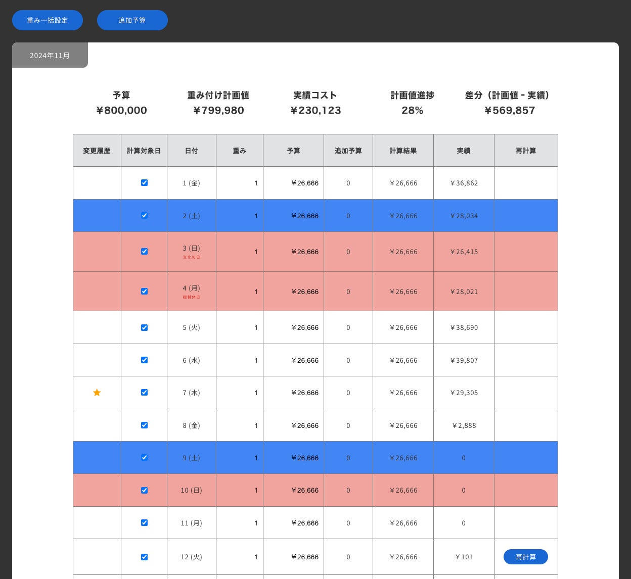全体予算を各メディアの予算に振り分け、日別の予算計画値の自動計算、実績値との乖離、日予算の再計算、日別の予算の重み付け、追加予算の別管理など予算関連の機能を集約しています。