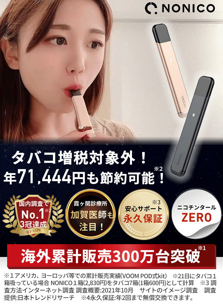 NONICO(ノニコ)は、喫煙者の健康を守り、快適なスモーキングライフをお過ごしいただくことを⽬標としている、 独⾃技術搭載のニコチン0タール0の電⼦タバコです。