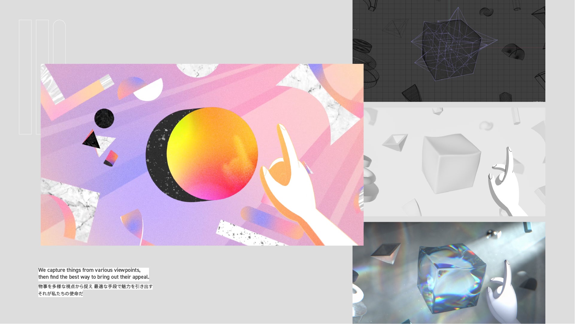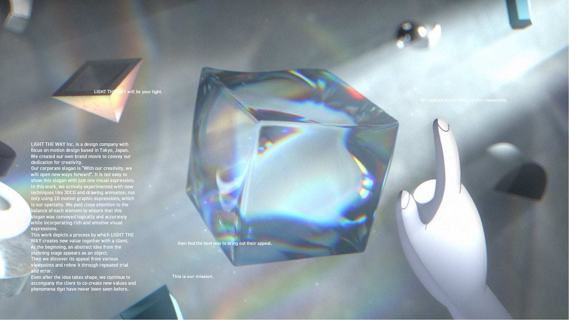 このムービーでは、LIGHT THE WAYがクライアントと共に新しい価値を創造するプロセスを描いています。冒頭では、企画段階の抽象的なアイデアがオブジェクトとして登場し、私たちが多角的な視点からその魅力を見い出し、試行錯誤を繰り返して磨き上げていきます。アイデアが具象化した後も、私たちはクライアントと伴走し続け、まだ見たことのない新たな価値や現象を共創していきます。