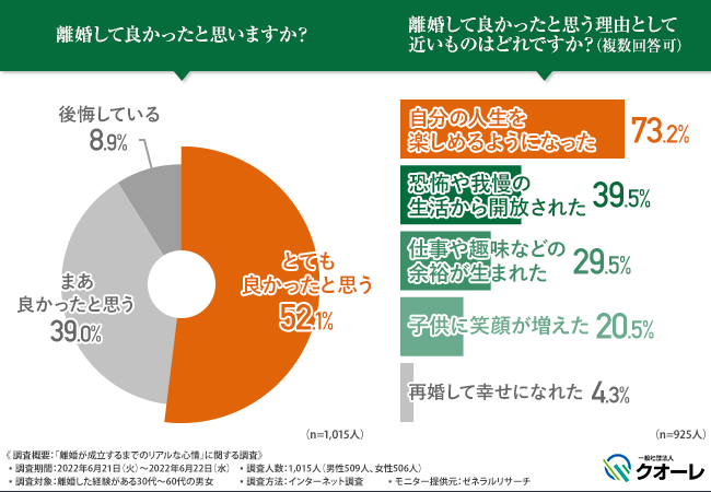 7割以上が「離婚して自分の人生が楽しめるようになった」と回答