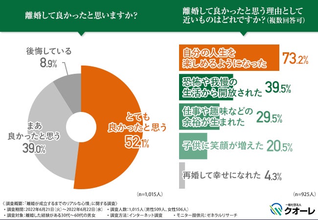 「離婚して良かったと思いますか?」と質問したところ、『とても良かったと思う(52.1%)』『まあ良かったと思う(39.0%)』『後悔している(8.9%)』という結果となりました。