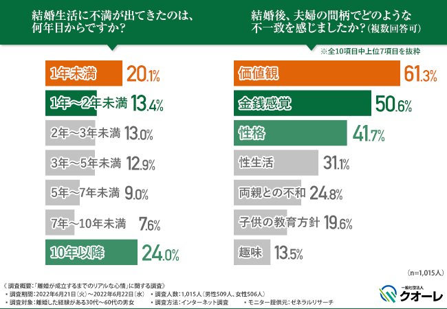 そこで、「結婚後、夫婦の間柄でどのような不一致を感じましたか?(複数回答可)」と質問したところ、『価値観(61.3%)』と回答した方が最も多く、次いで『金銭感覚(50.6%)』『性格(41.7%)』『性生活(31.1%)』『両親との不和(24.8%)』『子供の教育方針(19.6%)』『趣味(13.5%)』『特に不一致は感じない(6.2%)』『信仰や宗教など(4.4%)』と続きました。