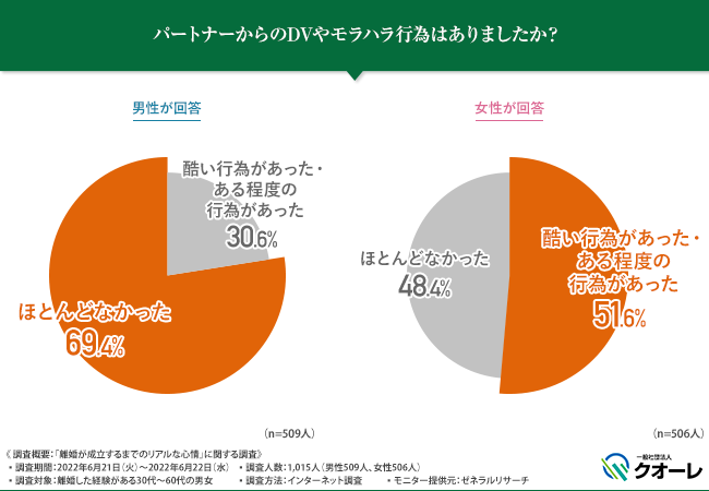 そこで、「パートナーからのDVやモラハラ行為はありましたか?」と聞いたところ、男女別の結果は下記の通りとなりました。