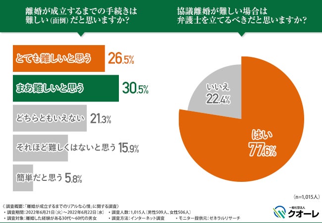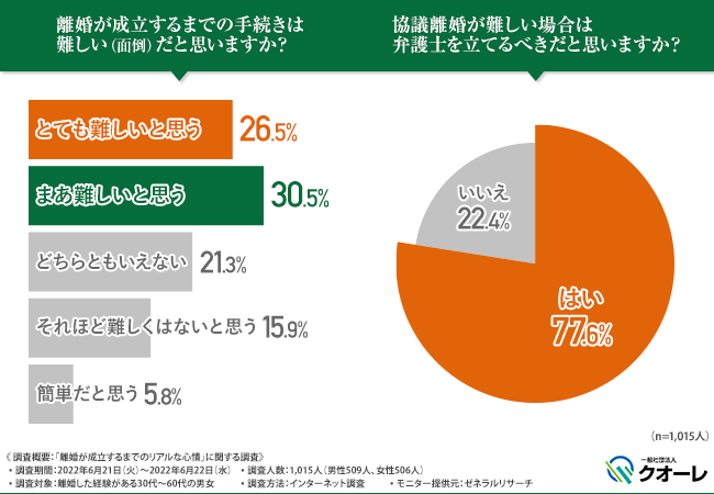 一般社団法人クオーレ(本社所在地:東京都台東区、代表理事:豊田 潤)は、離婚した経験がある30代~60代の男女を対象に「離婚が成立するまでのリアルな心情」に関する調査を実施しました。