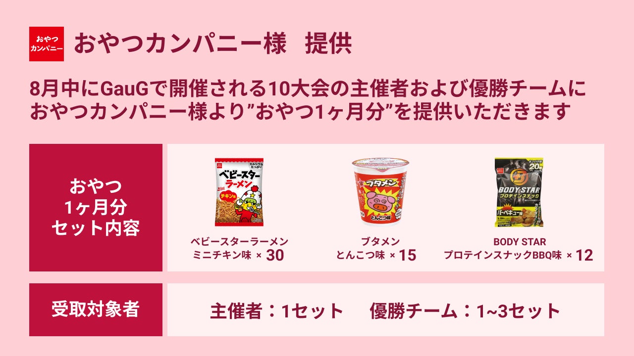 2022年8月中に『GauG』で開催した『VALORANT』もしくは『Apex Legends』の大会の主催者及び優勝チーム宛に豪華商品セットをプレゼントいたします。