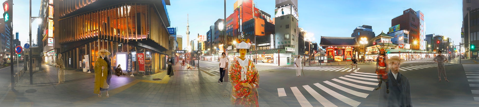 浅草浅草寺は1400年前、漁師が海より観音様を引き上げ、それを奉納した寺として始まり、この一帯も80年前には東京大空襲で廃墟と化した。そして復興した今では年間4000万人が集う。神社を中心に強運を引き寄せる象徴的な土地である。人と時間と光が交差する中、私たちは二面性に気づく。善と悪、昼と夜、生と死は全て表裏一体であり、現実には異なる側面が同時に存在する。生死は裏と表となるので、この写真は裏から見たものとして、反転されている。写真のパノラマは一つの合理的な画面に閉じ込めると、全ては歪曲して現れる。我々の魂も現実の歪みのように、行ったり来たりしながら記憶の中で生きている。一周して繋がった、写真には13体の青年が時間、空間の異なる次元でその中に入っている。そして常に我々が住む街に感謝し、幸せを感じることが大事だ。