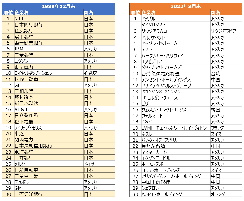 平成元年、時価総額ランキングのTop30のうち、21企業が日本企業であったのに対し、現在は日本企業からTop30から消えてしまいました。