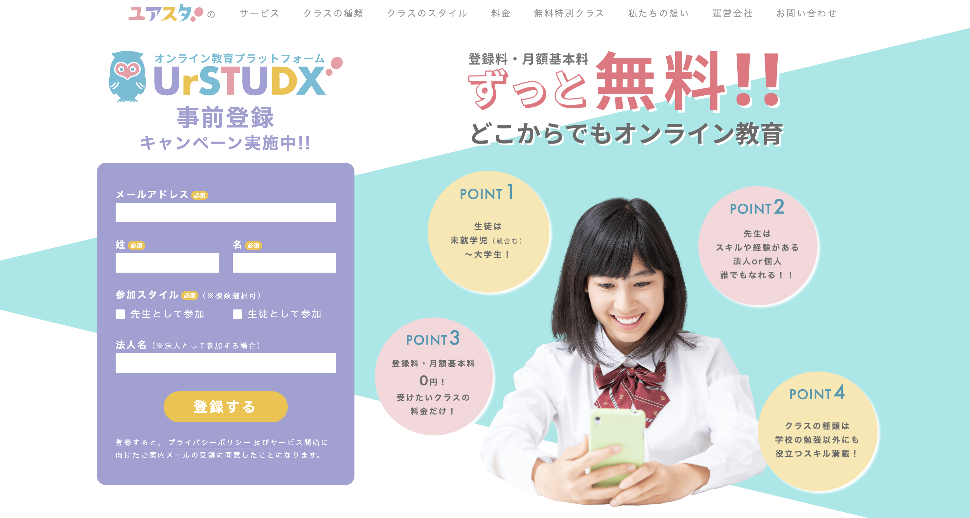 「UrSTUDX」は、未就学児~大学生の子ども達が、自身の学びたいスキルを、オンライン上で学ぶことができる教育プラットフォームです。