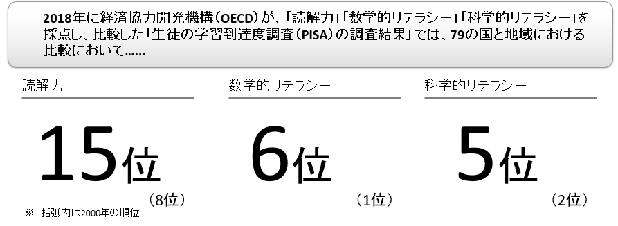 上記は2018年のデータ(2022年4月1日で最新)を2000年と比較したものですが、の順位下落と共に、考える力が不足する教育課題が見てとれます。