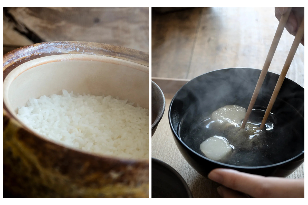 土鍋ご飯、漬け物、ご飯のお供、お味噌汁