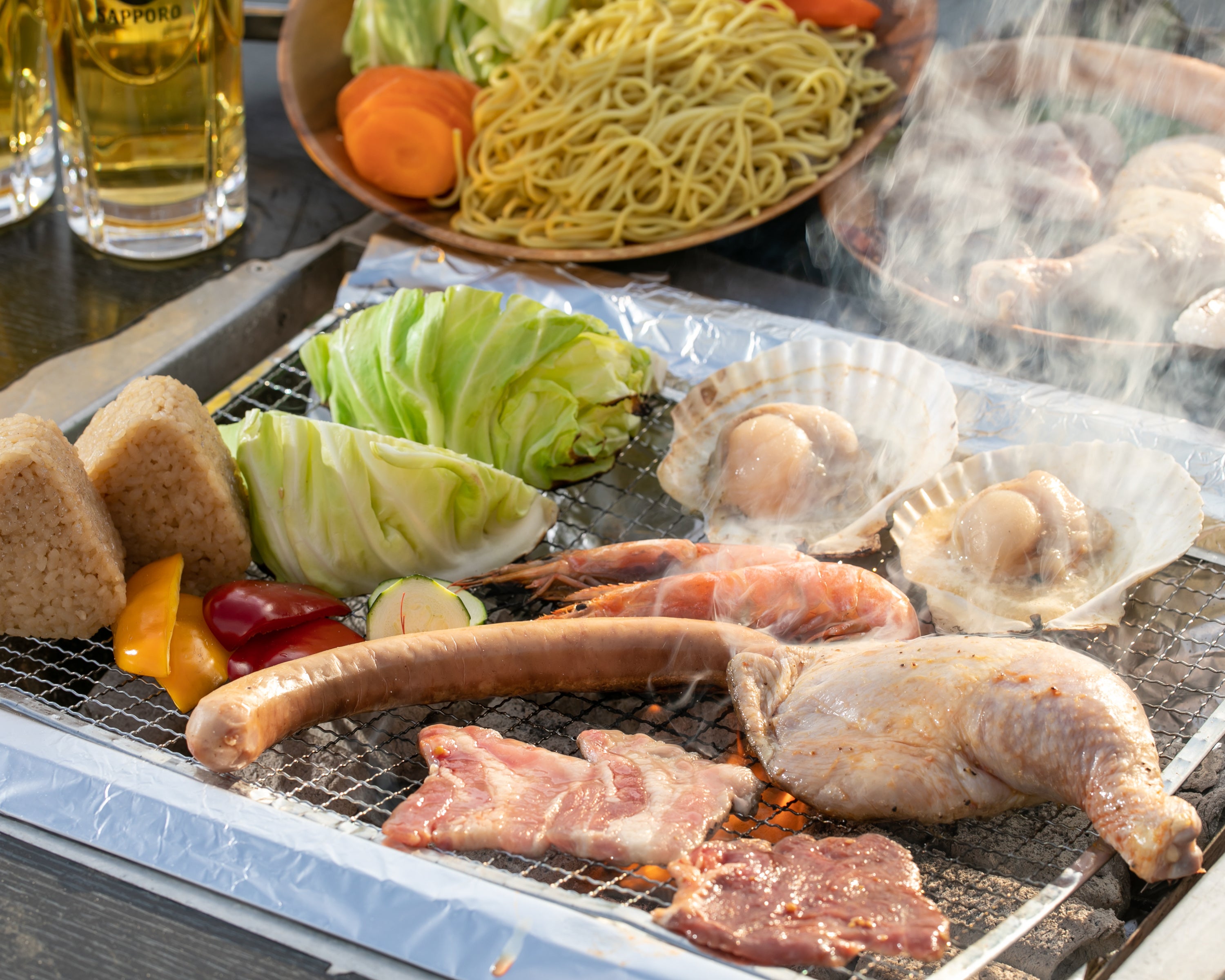 持ち込んでいただいた⾷材や店舗でご⽤意している⾷材を会場内のバーベキューコンロで焼きながら⾷べていただけます。