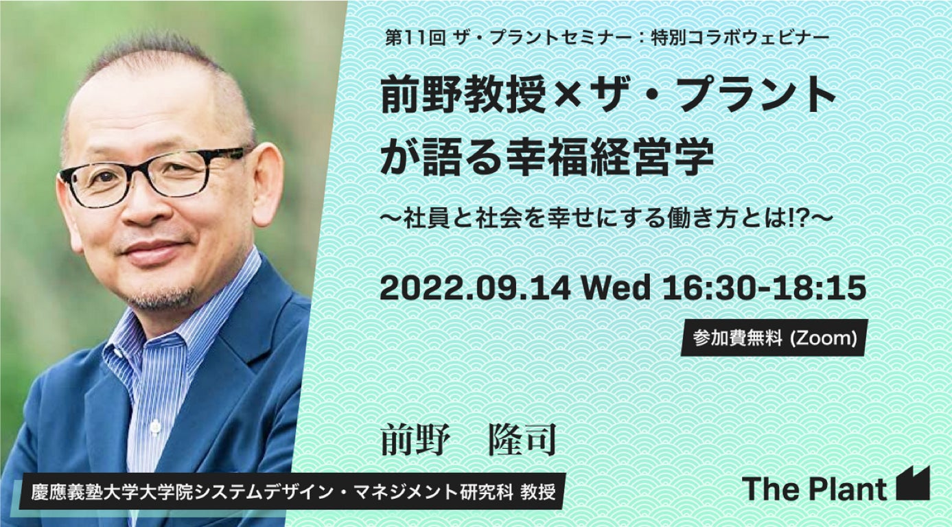 『特別コラボ無料ウェビナー』前野隆司教授 × ザ・プラントが語る話題の幸福経営学(ウェルビーイング) 「社員と社会を幸せにする働き方とは?」2022年9月14日(水)午後4:30からオンライン無料開催