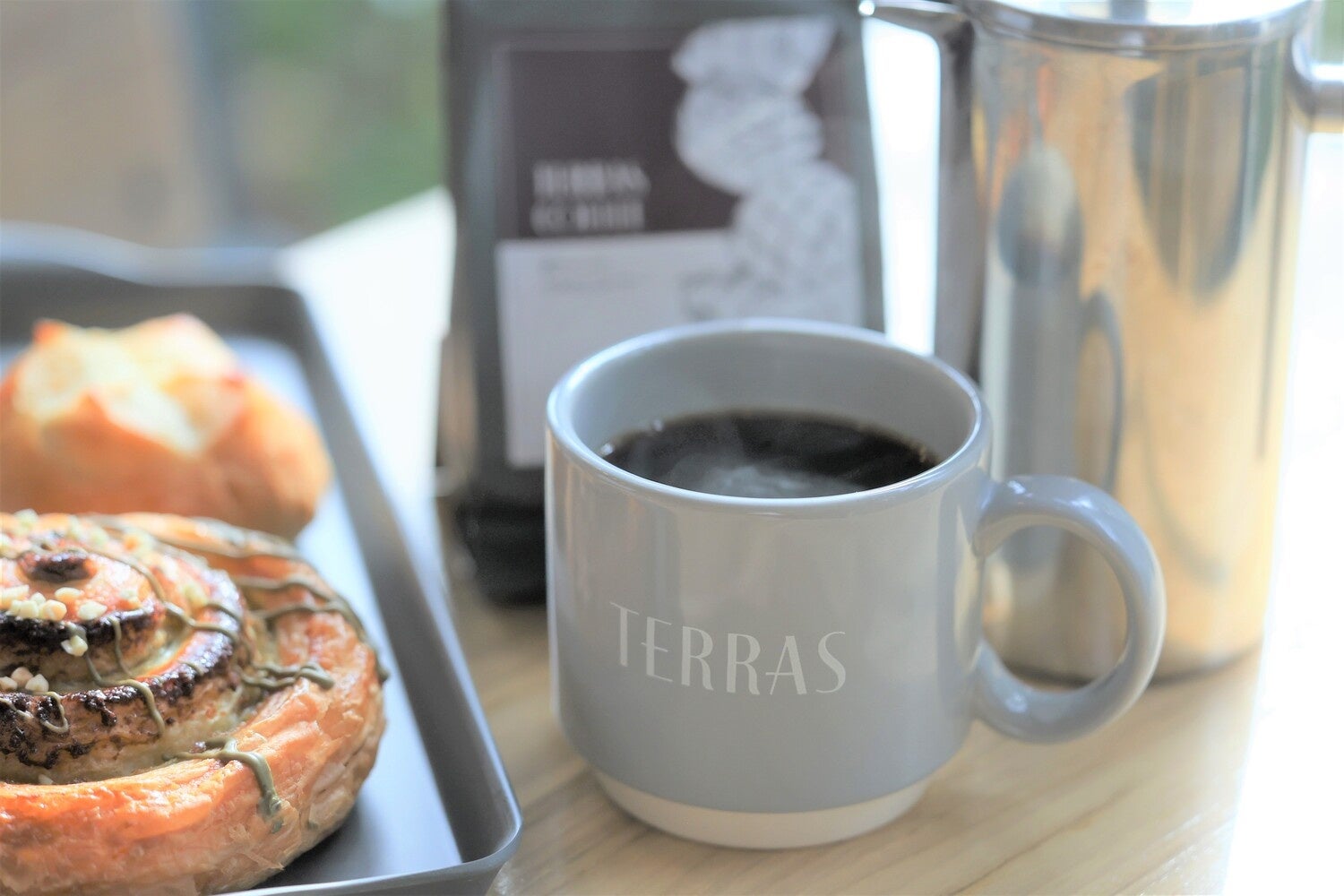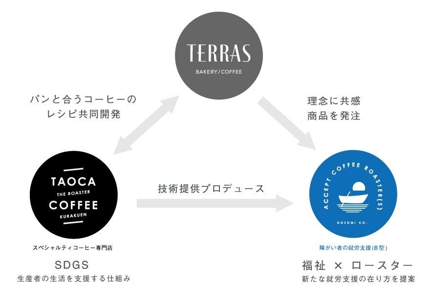 さらにTERRASがご提供するコーヒーは、兵庫県西宮市の「TAOCA COFFEE」と、障がい者就労支援をおこなう「ACCEPT COFFEE」、そして、TERRASの3者がコラボレーションして商品開発したもの。3者で何度も試作と修正を繰り返し、TERRASでご提供する美味しいパンにぴったりなスペシャルティーコーヒーを開発しました。自分たちがご提供するコーヒーが少しでも社会の役に立ってほしい。そんな想いをもとに自慢のコーヒーをご提供しています。