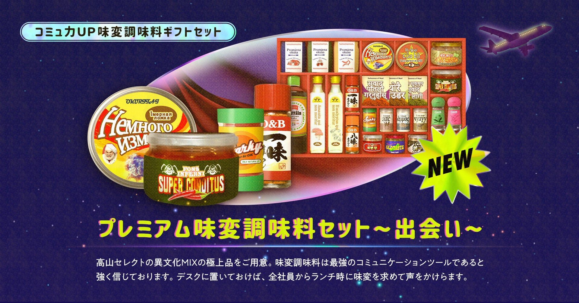 高山セレクトの異文化MIXの極上品をご用意。味変調味料は最強のコミュニケーションツールであると強く信じております。デスクに置いておけば、全社員からランチ時に味変を求められて声をかけられます。