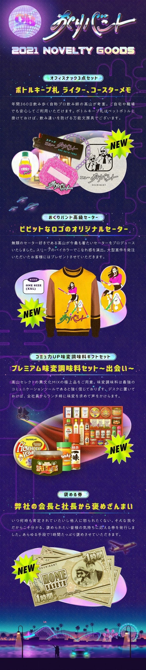 新体制に伴いおくりバント社は、唯一の武器である営業力を更に向上させることが可能になりました。新たな経営戦略として、新規顧客獲得のためにオリジナルノベルティを制作予定でございます。完成した暁には下記のノベルティを持参し、ぜひご挨拶をさせていただきたく存じます。