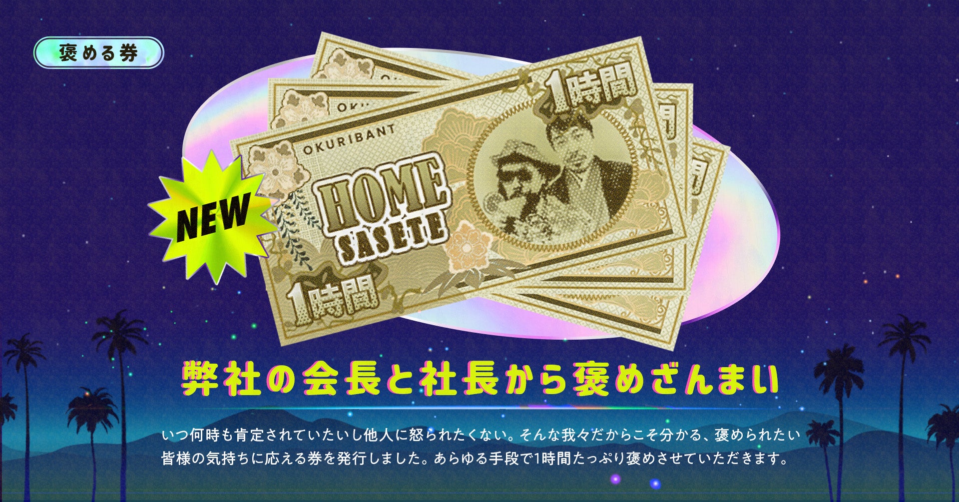 いつ何時も肯定されていたいし他人に怒られたくない。そんな我々だからこそ分かる、褒められたい皆様の気持ちに応える券を発行しました。あらゆる手段で1時間たっぷり褒めさせていただきます。