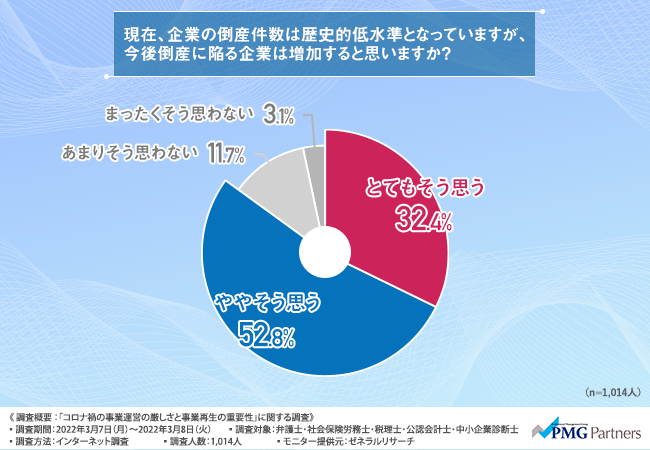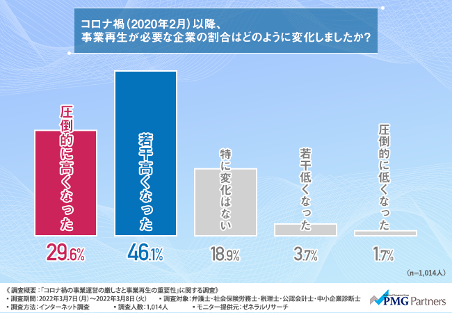 株式会社PMGパートナーズ(本社:東京都新宿区、代表取締役:佐藤 貢)は、弁護士・社会保険労務士・税理士・公認会計士・中小企業診断士を対象に、「コロナ禍の事業運営の厳しさと事業再生の重要性」に関する調査を実施しました。