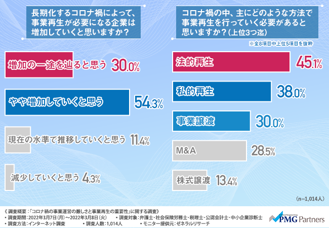 そこで今回、企業の合併、買収、再生、事業継承に関わるコンサルティング業務を行う株式会社PMGパートナーズ(https://pmg-partners.jp/)は、弁護士・社会保険労務士・税理士・公認会計士・中小企業診断士を対象に、「コロナ禍の事業運営の厳しさと事業再生の重要性」に関する調査を実施しました。