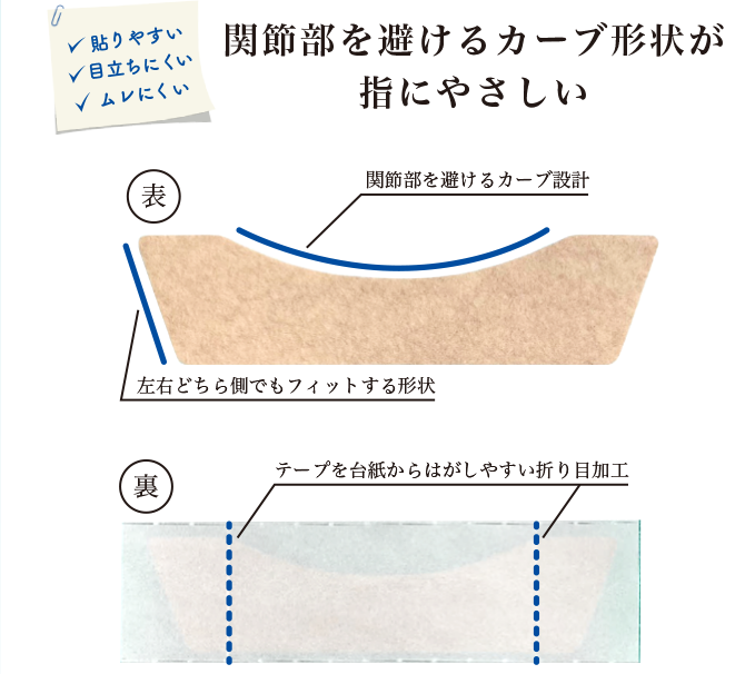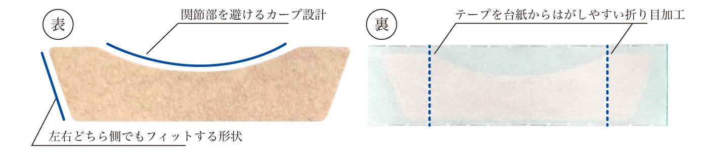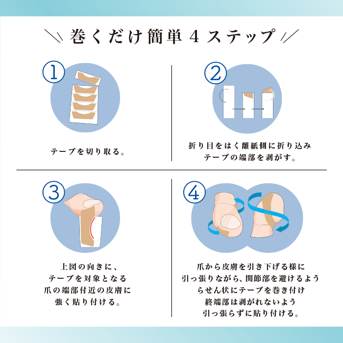 本製品は、医療現場の声をもとに開発いたしました。爪周辺の皮膚に貼り、皮膚を伸ばし、爪のくい込みを和らげるように使用します。適度な伸縮性のある基材と皮膚のカブレに配慮した粘着剤を採用し、特殊形状によりフットケアのテーピング法に最適な製品となっています。