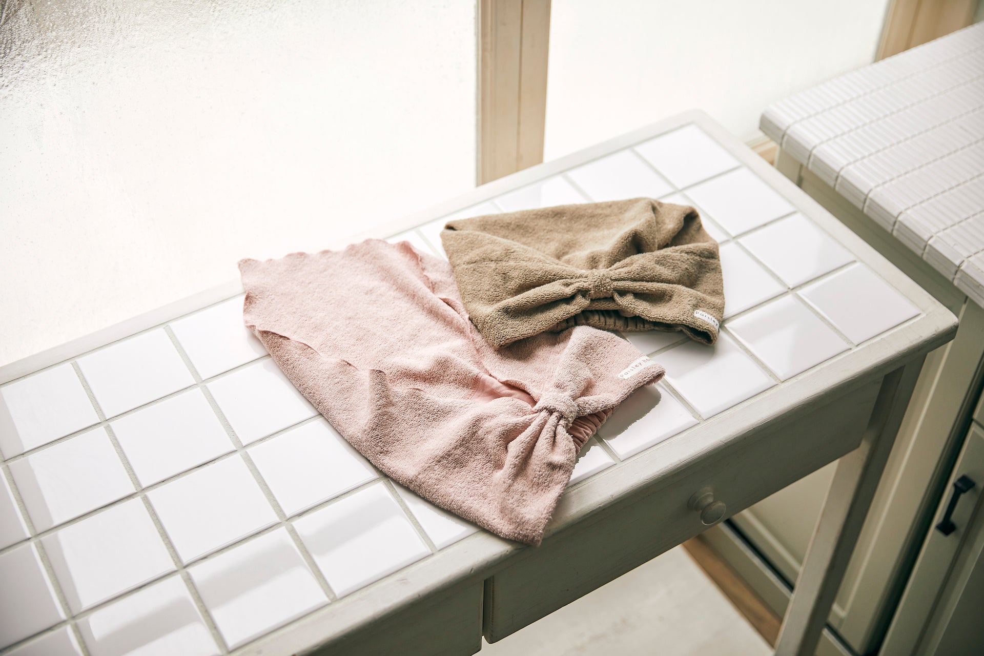 水気をしっかり吸収しながらも、お洗濯の手間にも配慮した軽やかで心地いい着心地。セットのヘアキャップは、濡れている髪にさっとかぶって手軽にタオルドライができ、スキンケアの合間にも便利なアイテムです。