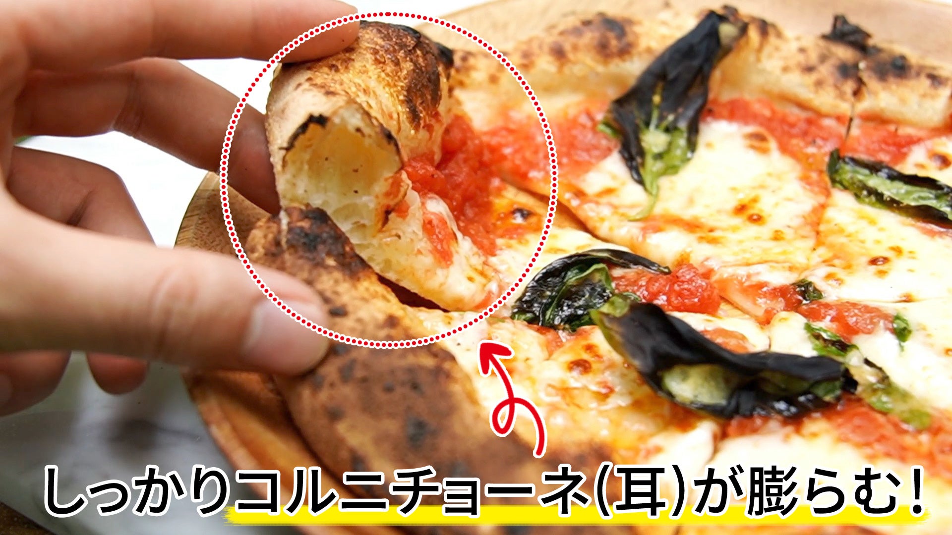 ENROのピザ生地は加水率が65%と非常に高いです。加水率とはピザ生地全体における水の割合です。高い加水率のピザ生地は、外はサクッと中はモチッとした食感に仕上がります。また、ピザの耳「コルニチョーネ」も膨らみやすく、食感だけでなくビジュアルも良くなるのがポイント!