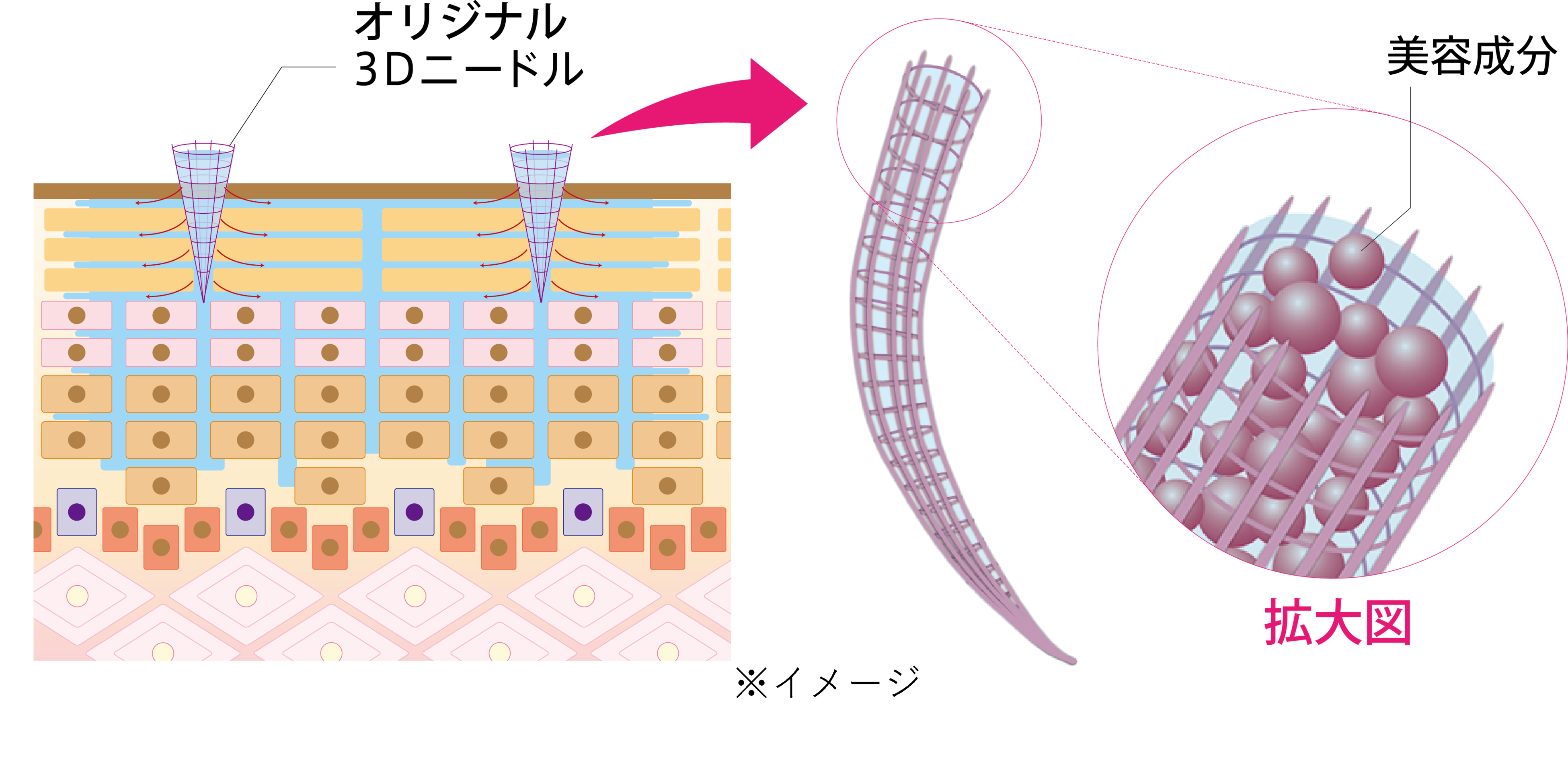 粒子の細かい「オリジナル3Dニードル(※6)」を美容成分と共にまんべんなく浸透(※7)させることで、肌にハリ・ツヤ・うるおいを与え、肌をひきしめます。